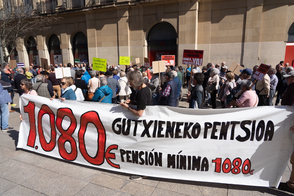 Sendas marchas en Bilbo e Iruñea han dado comienzo este lunes a la semana de movilización impulsada por el Movimiento de Pensionistas de Euskal Herria en favor de la pensión mínima de 1.080 euros. Concentrados ante el Consistorio bilbaino, cientos de manifestantes han acompañado por calles céntricas del Botxo a las 30 personas que han iniciado un encierro y ayuno en un local de Indautxu mientras otra marcha en la capital navarra se ha dirigido a las sedes del Parlamento y Gobierno para instar al Ejecutivo de María Chivite a que complemente hasta esa cantidad las pensiones más bajas.