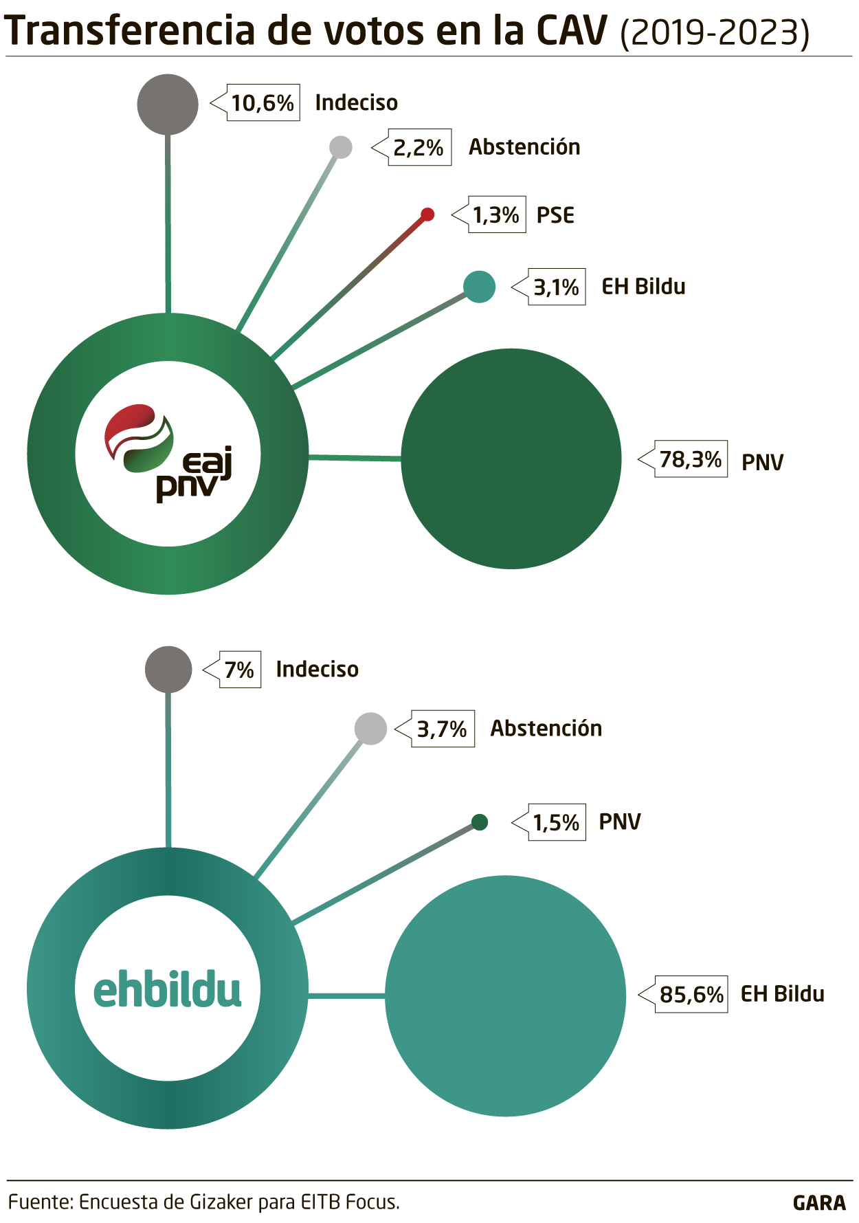 Ni los titulares que dejó hace unas semanas el EiTB Focus sobre las elecciones forales del próximo 28 de mayo, ni los posteriores análisis realizados con los microdatos de la amplia encuesta realizada por Gizaker y GAD3 para el ente audiovisual público refirieron los movimientos en la bolsa de votos que se disputan PNV y EH Bildu, los dos principales contendientes en Araba, Bizkaia y, sobre todo, Gipuzkoa.