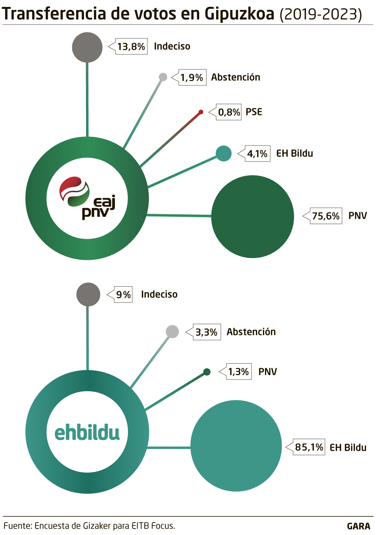 Las tendencias detectadas por la encuesta de Gizaker se agudizan si se pone el foco en Gipuzkoa, el herrialde más disputado entre PNV y EH Bildu, donde algunas encuestas dejan a la izquierda independentista a un paso del sorpasso. En el caso del EiTB focus, la distancia todavía se mantiene en 3,7 puntos, pero para ello, el sondeo apunta a una gran entrada de votos abstencionistas en la hucha jeltzale. Porque la bolsa de votos que se disputan ambas formaciones soberanistas se decanta de forma bastante pronunciada a favor de EH Bildu, según el trabajo demoscópico.