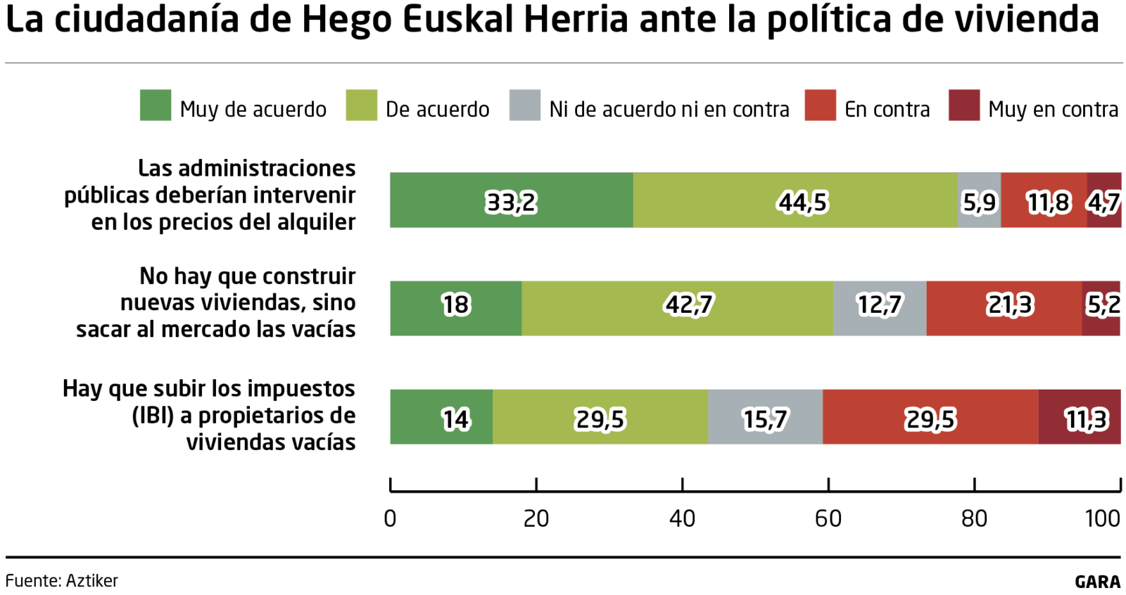 Según la encuesta, sin embargo, no parece que sean estos los parámetros en los que se sitúa la sociedad vasca. El 77,7% de las 2.000 personas encuestadas responde que está de acuerdo o muy de acuerdo con la afirmación de que «la Administración Pública debe intervenir para regular los precios de los alquileres». Cabe entender, por lo tanto, que una Ley de Vivienda que prevé instrumentos para, precisamente, poner límite a los alquileres, habrá sido bienvenida por una amplia mayoría de la ciudadanía.