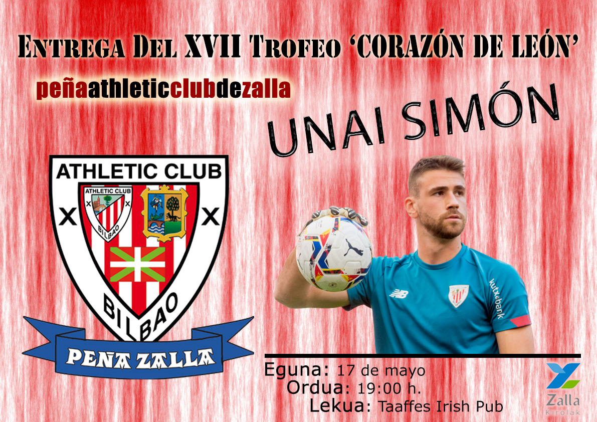 La Peña Athletic Club de Zalla entregará este miércoles por la tarde el trofeo Corazón de León a Unai Simón. El acto se celebrará en el Taaffes Irish Pub de la localidad a partir de las 19.00 horas. Este galardón pretende distinguir «a aquellos jugadores del primer equipo rojiblanco que más se identifican con los valores que representa el Athletic».