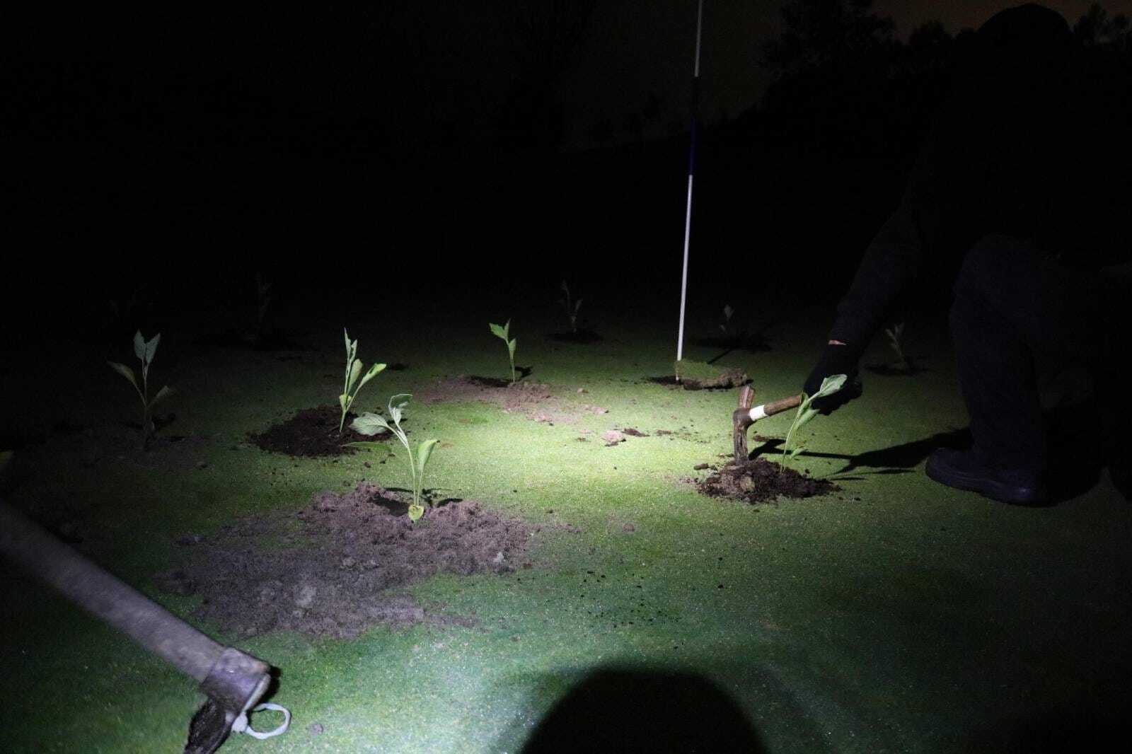 «Cuando entramos, nos dimos cuenta de que estaban ya los aspersores regando, pero no en el hoyo al que nos dirigimos», narra el activista. Así que se apresuraron cavar unos cuantos agujeros y a tapar con mimo los plantones de berenjena. Acto seguido, les echaron un poco de compost alrederor para proveerles de nutrientes.