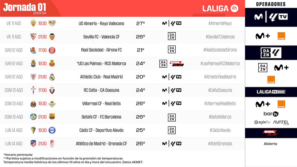 Los que de momento no cambian son los otros dos partidos del resto de representantes vascos. El Athletic recibirá al Real Madrid el 12 de agosto a las 21.30, mientras que el Alavés visitará al Cádiz el lunes 14 de agosto a las 19.30.