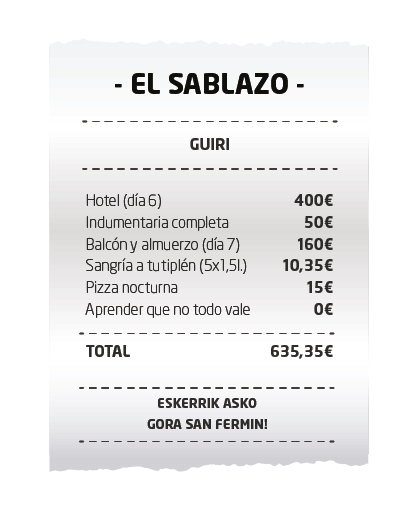 Habrá quien piense que la factura que acompaña estas líneas es desorbitada, pero para los y las guiris acostumbrados a pagar por tirarse desde lo alto de la fuente de la Nabarreria o por entrar a la plaza Consistorial durante el chupinazo, pues, oye, ni tan mal.