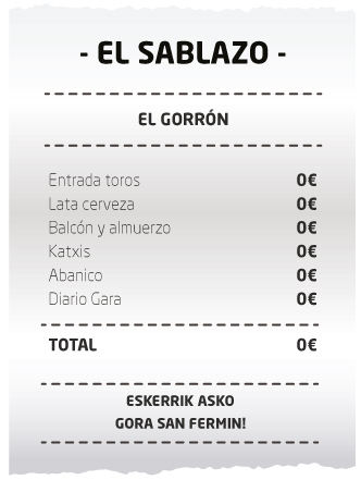 Por no gastar en sangrías y sorbetes para sobrevivir en Sol, el gorrón decidió armarse con un abanico que encontró por ahí, que por el dibujo parecía elegido por una niña llamada Lur. «Estos muetes les sangran de todo a los abuelos!», pensó para sus adentros. Una vez entró en el ruedo, se adosó a los txarangueros a sabiendas de que a su lado vuelan los katxis gratis, no solo en la plaza, también en la ronda nocturna.