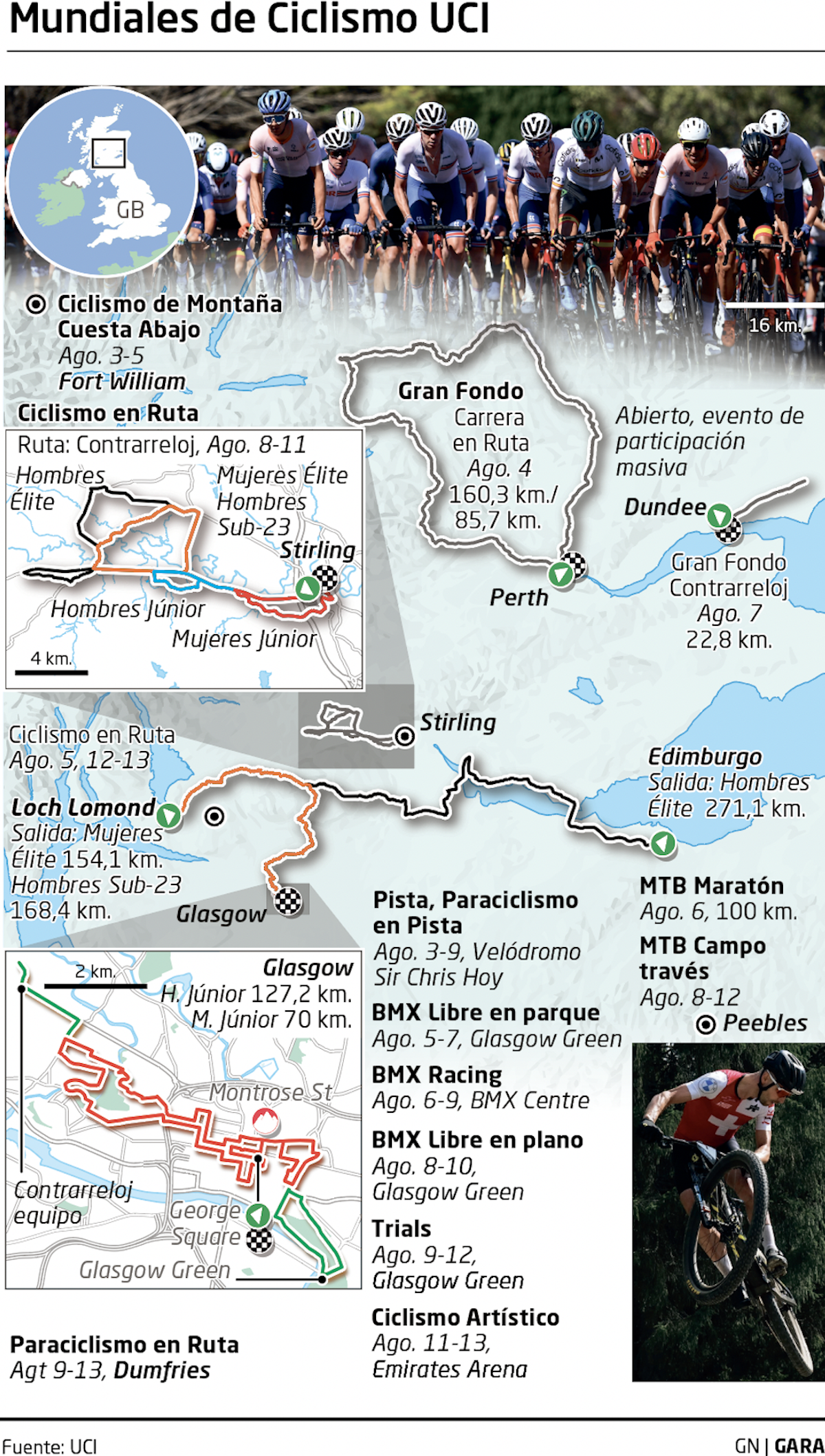 El epicentro será Glasgow, pero otras sedes, como Edimburgo, serán partícipes en la concentración de 8.000 ciclistas aficionados y de élite de más de 120 países, y que coronará a más de 190 campeones mundiales en los 13 Mundiales en juego.