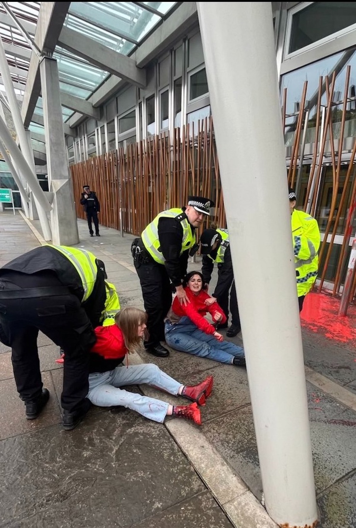El 26 de abril lanzaron pintura roja al Parlamento escocés para denunciar los intentos para prohibir sus acciones de protestas. En la declaración que repartieron ese día ya anunciaban que seguirían con sus acciones de protesta hasta que se atiendan sus demandas, lo que cumplieron el domingo.