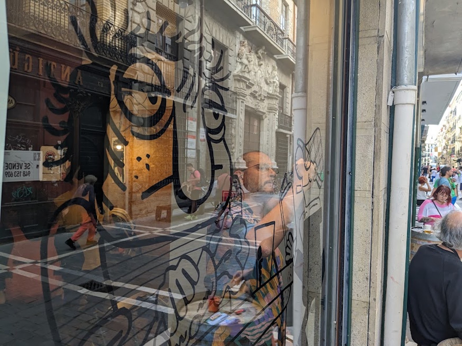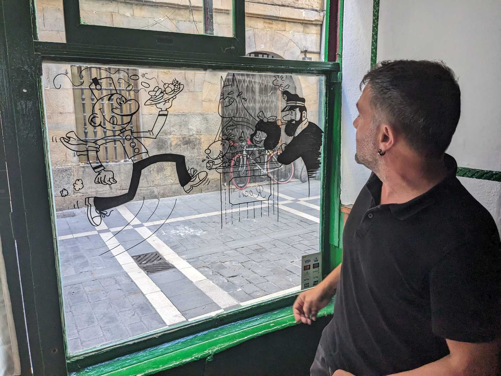 Belatz ilustrando la ventana del café Roch. (NAIZ)