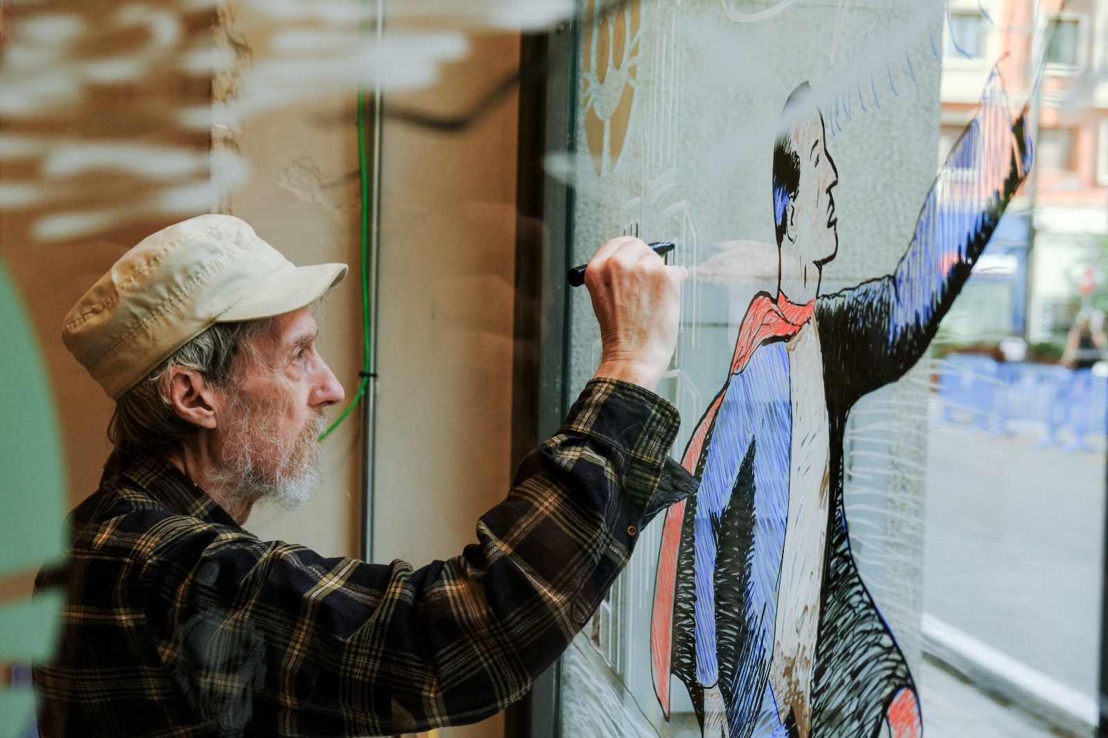 Van justo cinco décadas entre la más joven de los dibujantes, Itziar Repáraz, de 32 años, y el mayor de todos ellos, Pedro Osés. Ambos forman parte de un equipo de 11 ‘komikilaris’ que trabaja estos días convirtiendo escaparates en viñetas.