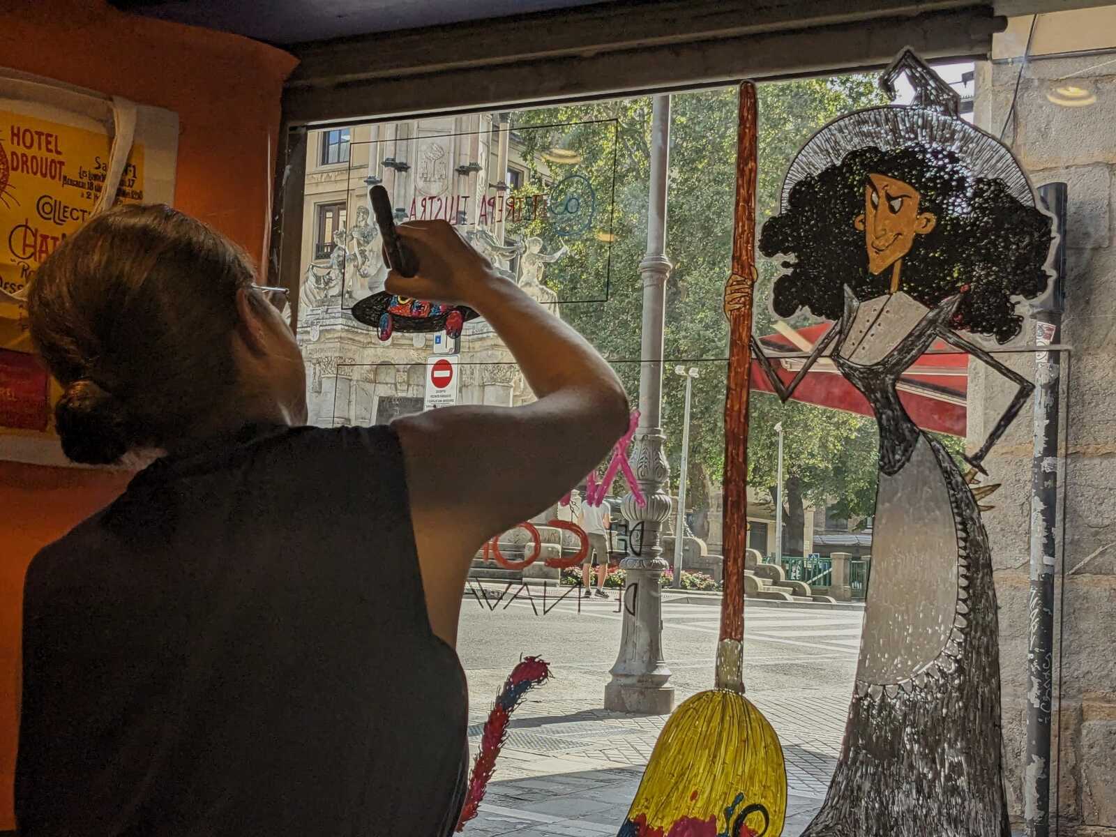 Repáraz trabaja sentada en la parte interior de un pequeño ventanal de la papelería que se encuentra en el cruce entre Comedias con Sarasate. «Mi idea es, partiendo de un personaje icónico, como es una bruja, crear una imagen que contenga una historia», explica. Así, la escoba de la bruja se convierte en pincel y el pequeño gato que acaba de colorear entra por un agujero apareciendo en otro punto de la viñeta.
