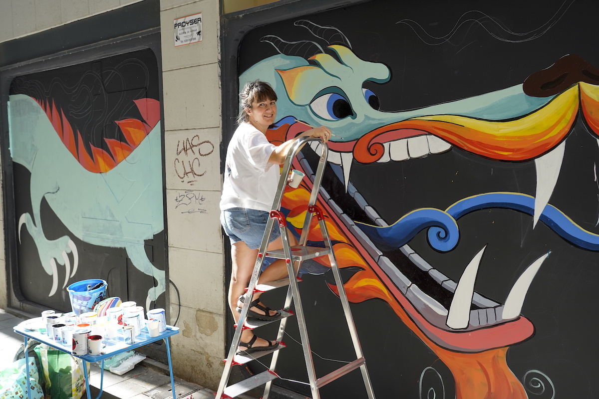 Todas las obras durarán un mes, salvo una. A Raquel Samitier le ha tocado en suerte pintar no un escaparate, sino el mural lateral de la librería Elkar, en la calle Indatxikia. Ha apostado por un dragón saliendo de un cómic. «El año 2024 será el del dragón y la idea es que dure hasta la próxima edición del Salón, de ahí surgió la idea», dice Samitier.