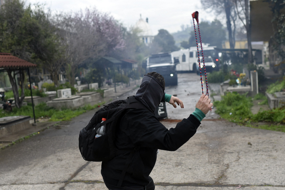 Carabineros han repelido a unas decenas de ellos en las inmediaciones del Palacio de La Moneda cuando han superado el cerco perimetral de la sede presidencial. Posteriormente, efectivos de Carabineros los han dispersado con camiones con cañones de agua y de gas y las cargas y enfrentamientos han continuado en la Alameda.