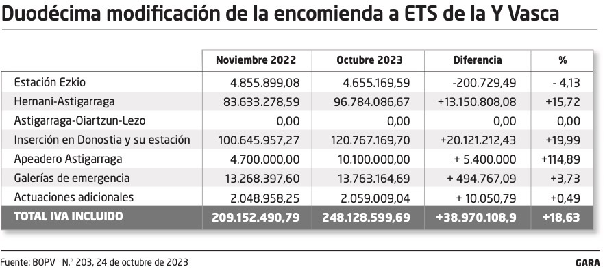 En el BOPV, donde se recoge la decisión, no puede encontrarse una explicación más concreta. El 24 de noviembre de 2022 tuvo lugar la undécima modificación de la encomienda a Euskal Trenbide Sareak del tramo guipuzcoano de la «Y vasca», que fijó en 209,15 millones de euros el coste de la ejecución de las obras e hizo un reparto por anualidades hasta 2025.