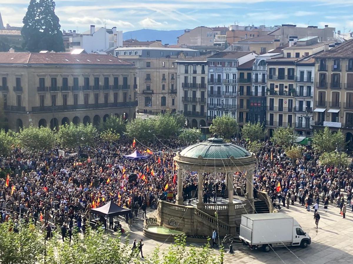 Numerosas personas han acudido a la protesta impulsada por el PP, que se lleva a cabo de forma simultánea en todas las capitales de provincia del Estado con el respaldo de Vox y a la que, en el caso de Nafarroa, ha animado también a participar UPN.