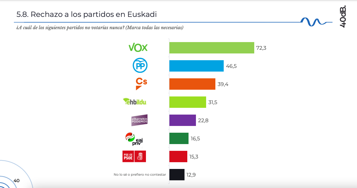 Uno de los aspectos más destacados es el hecho de que un 40,6% de la población se muestra favorable a un cambio de Gobierno en Lakua, mientras que el 22,2% preferiría continuar con el actual. Sin embargo, se podría decir que el pesimismo impera entre los que abogan por un cambio, ya que solo el 25% cree que se hará efectivo en los próximos comicios. Un 39,9% vaticina que no habrá alternancia en el siguiente Ejecutivo autonómico.