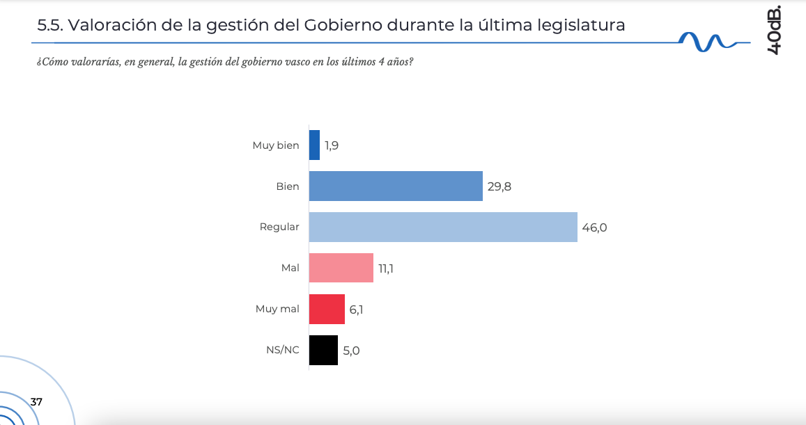 En este sentido, en el sentir general impera que el Gobierno de Lakua ha realizado una gestión «regular» (46%) durante los últimos cuatro años. El 31,7% valora su trabajo con un «muy bien» (1,9%) o «bien» (29,8%), mientras que el 17,2% apunta a que lo ha hecho «mal» (11,1%) o «muy mal» (6,1%).