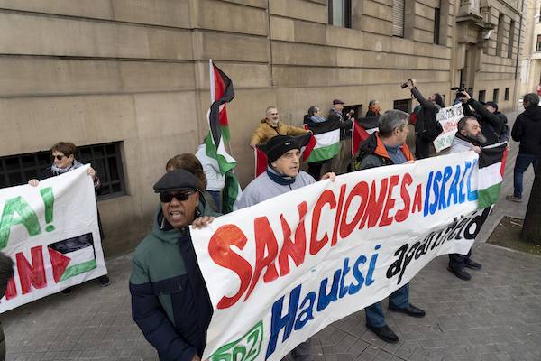 Las personas presentes portaban banderas palestinas, mientras gritaban consignas como «Palestina askatu», «Estado sionista, estado terrorista» o «Israel hiltzaile, Europa laguntzaile».