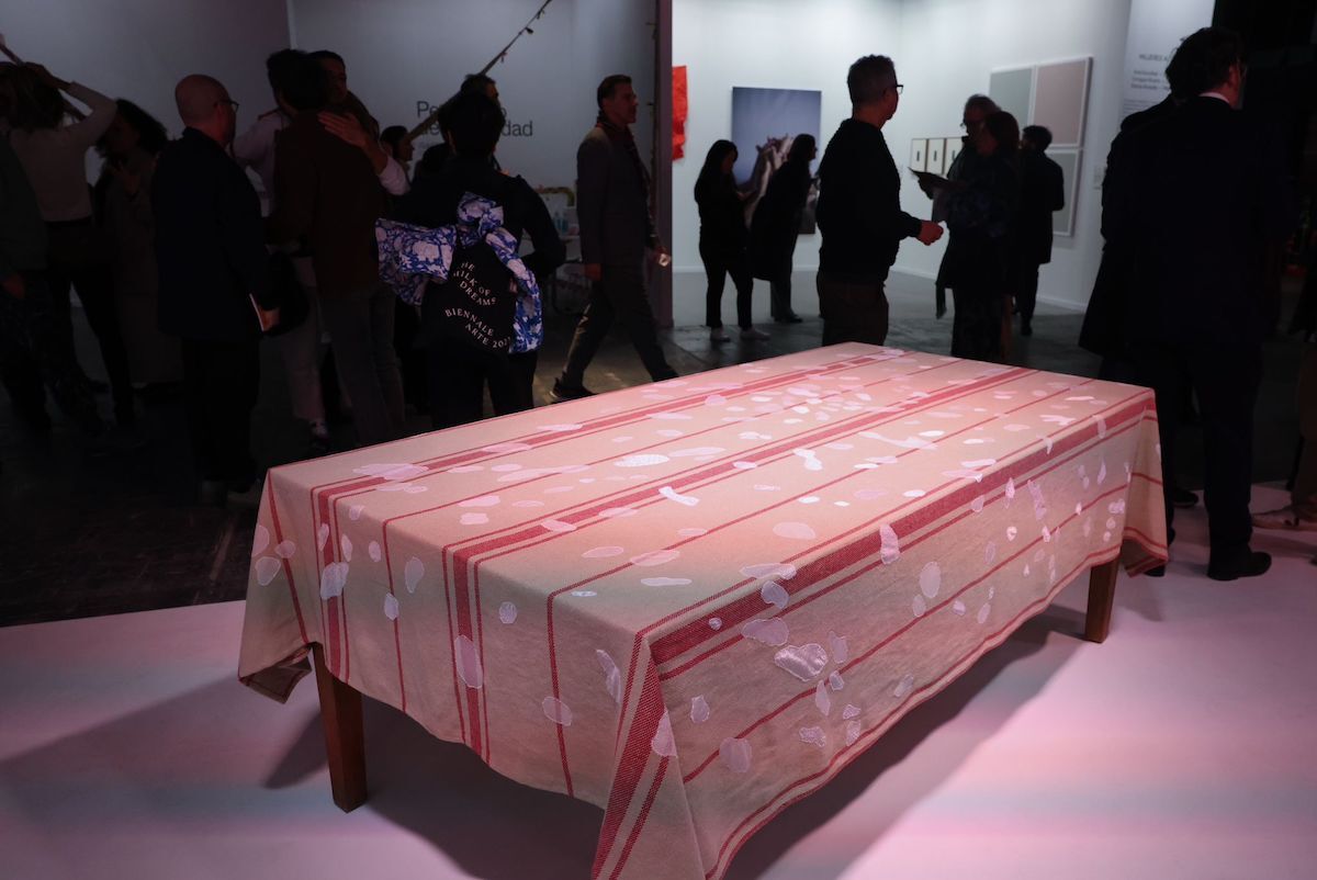 Quizá por eso a Jiménez Landa le ha hecho especial ilusión este premio, al reconocer una obra realizada en colaboración con la artesana bordadora Encarnita Berrio. Juntos han creado un mantel en el que se refleja el impacto de los rayos del sol sobre la tela y donde se juega con la idea de la fugacidad del tiempo.