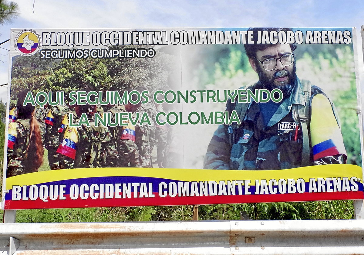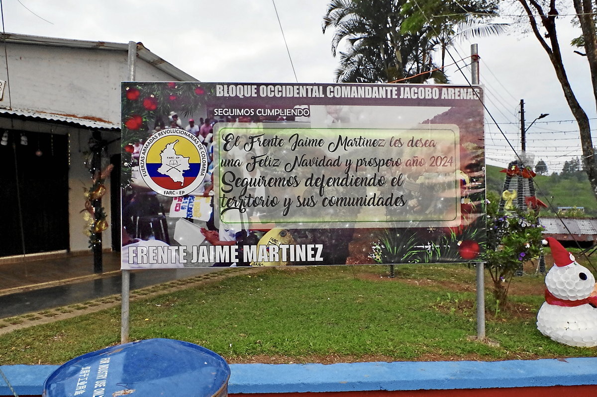 En la carretera, grandes carteles informan a los visitantes sobre la naturaleza del territorio en el que se adentran. «Aquí seguimos construyendo la Nueva Colombia», anuncia uno de ellos. De fondo, imágenes de hombres y mujeres vestidos con uniformes verde oliva. Todos llevan la misma firma: ‘Bloque occidental Jacobo Arenas’, nombre de la unidad militar perteneciente a las Fuerzas Armadas Revolucionarias de Colombia - Ejército del Pueblo (FARC-EP) que actúa en la zona. Ni la Policía ni el Ejército están presentes en el lugar. Por todas partes, hombres y mujeres jóvenes portan discretamente un arma cuya empuñadura sobresale de sus pantalones vaqueros. Son milicianos, las unidades urbanas de la guerrilla. «Bienvenidos a este territorio liberado», anuncia con toda seriedad Tomás, miembro de la organización armada.