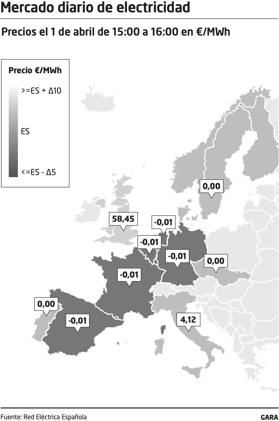 El aumento de electricidad generada con renovables lo único que está consiguiendo es rebajar el precio. Además, Europa no es tan grande y la estrategia ha sido similar en todos los países, de modo que cuando las condiciones son favorables los precios caen en media Europa, como se observa en el mapa adjunto.