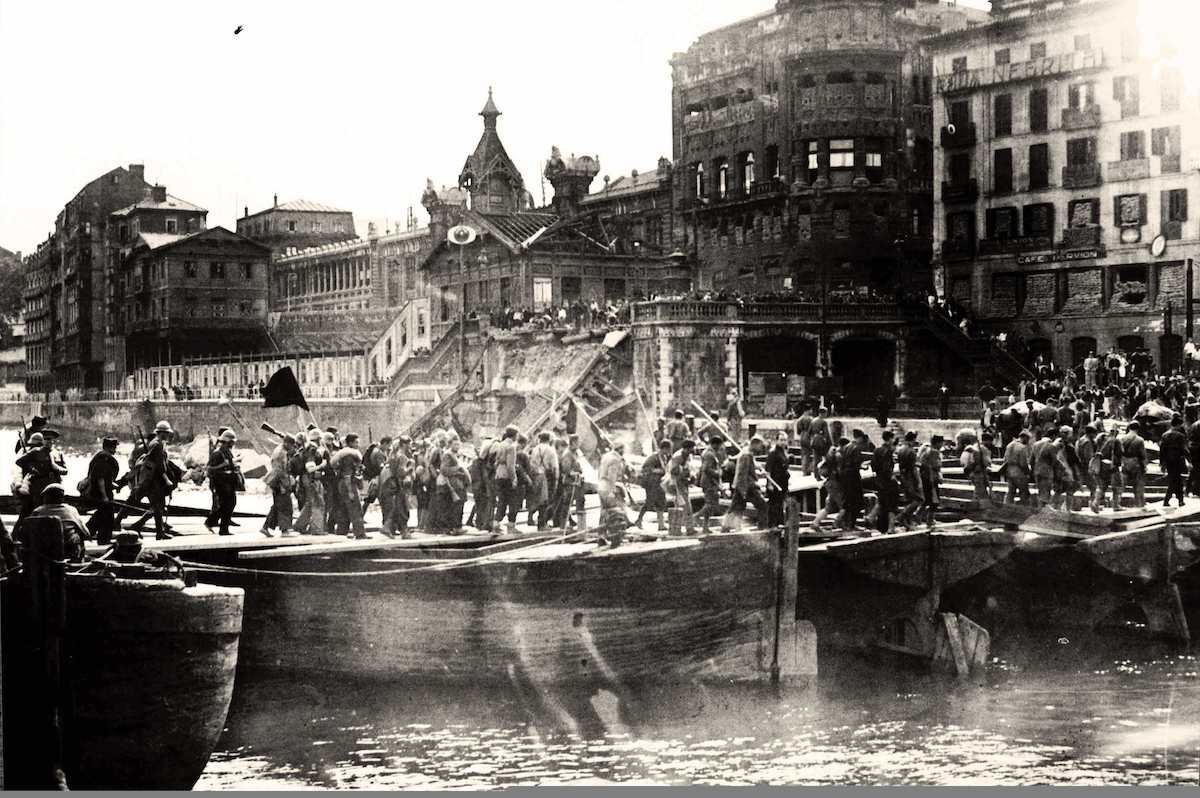 El 19 de junio de 1937, tras varios días de duras batallas en el cordal de Artxanda-Ganguren, el ejército franquista entró definitivamente en las calles de Bilbo de forma ordenada y sin oposición alguna. Lo hicieron por Atxuri y, tras recorrer el Arenal, llegaron al Ayuntamiento, quitaron la bandera republicana y colgaron la roja y gualda. La ciudad estaba prácticamente desierta, ya que en las últimas semanas, alrededor de 200.000 personas habían huido hacia el oeste por tierra y por mar, entre ellos unos 30.000 niños.