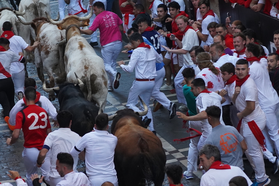 Una caída en la curva de Mercaderes, en la que un mozo con una americana azul a pasado momentos de peligro al ser arrollado y besar los adoquines junto a uno de los animales, ha dejado descolgados a dos de los toros, mientras los cabestros y los otros cuatro bureles de la ganadería gaditana enfilaban la Estafeta en pelotón.