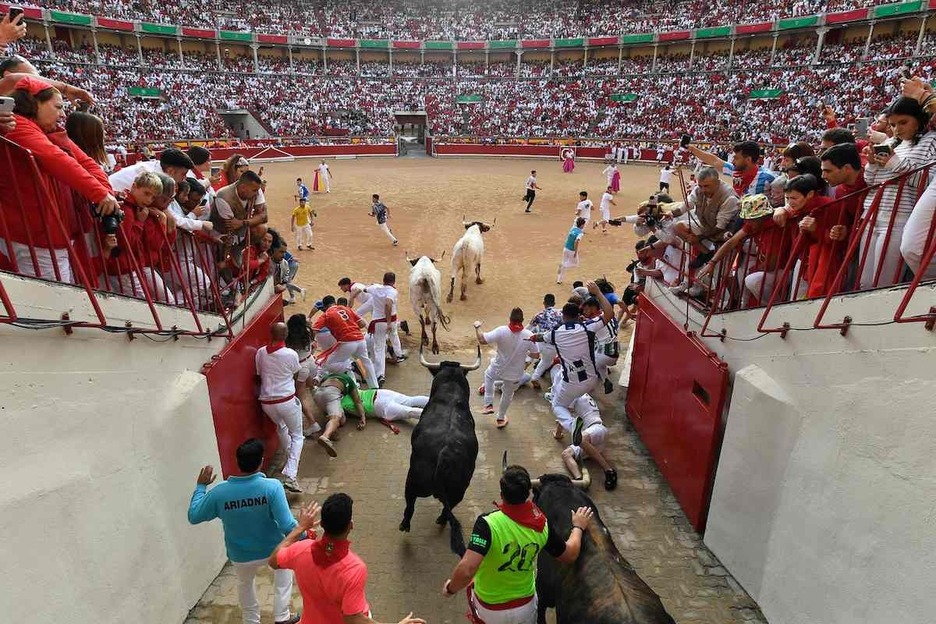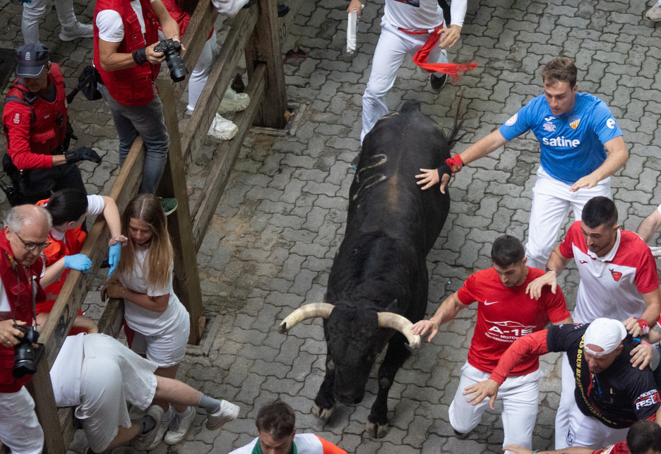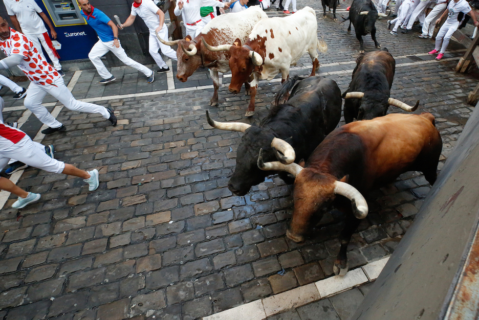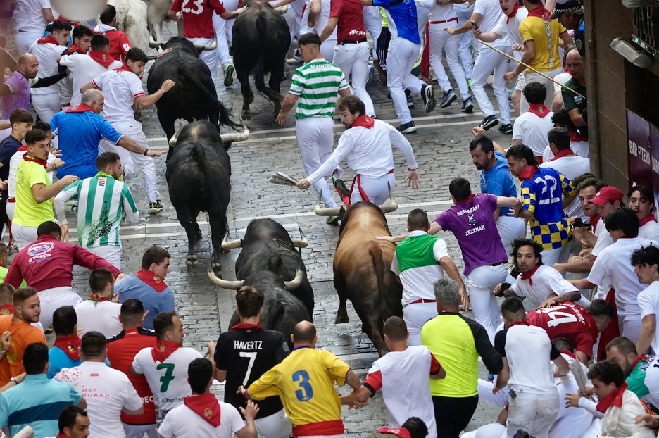 Nada que ver con lo ocurrido este miércoles, en que la primera parte de la carrera ha sido auténticamente impecable. Los toros han corrido como si conocieran al dedillo el recorrido. Apenas se puede citar una caída de una decena de mozos a la derecha, 50 metros después de entrar en Estafeta, sin que ello despistara a los bureles.