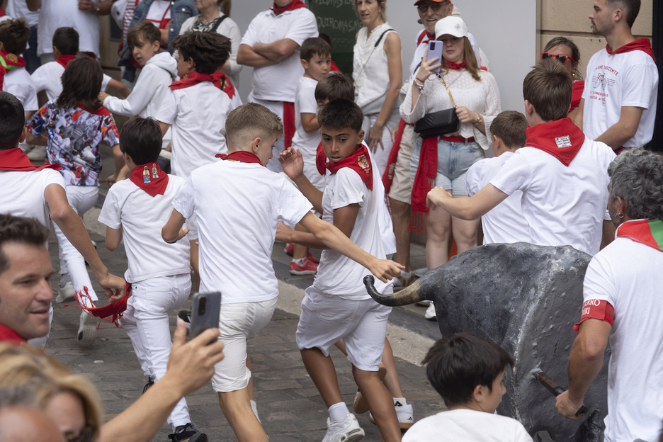 Tras regresar la manada a la hornacina, vuelta a empezar, ya que cada uno de los dos días de encierros txikis de las fiestas se realizan varias mangas para que la chavalería tenga la oportunidad de aprender lo que supone participar en este evento.