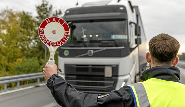 Un policía alemán detiene un camión en la frontera con Polonia.