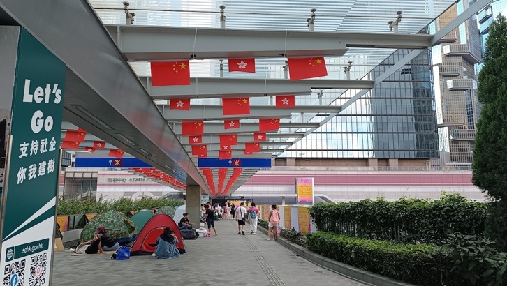 Es un domingo de julio, a media mañana y ya con más de 31 grados a la sombra, y decenas de miles de personas se congregan huyendo del fuerte sol de verano en el centro de Hong Kong. Justo al lado de grandes y emblemáticos edificios como el del HSBC, el de la Corte de Apelación, tiendas de lujo o en los mismos parques contiguos al LegCo, la asamblea parlamentaria de Hong Kong, cajas de cartón, snacks filipinos y decenas de miles de mujeres en grupos se reúnen, en el único día en que la mayoría de las trabajadoras domésticas filipinas pueden descansar.