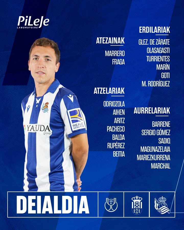 La Federación ubicó el duelo en una ventana internacional –la Real acudió a la justicia pero ayer le negaron un nuevo aplazamiento– y tres días antes del derbi de San Mamés. Entre eso y las molestias físicas de algunos, el técnico solo ha convocado a doce jugadores de la primera plantilla: Marrero, Odriozola, Ahien, Aritz, Pacheco, Urko, Olasagasti, Turrientes, Marín, Barrene, Sergio Gómez y Magunazelaia. También estaba Sadiq en la lista original, pero finalmente se ha caído por molestias en un isquio.
