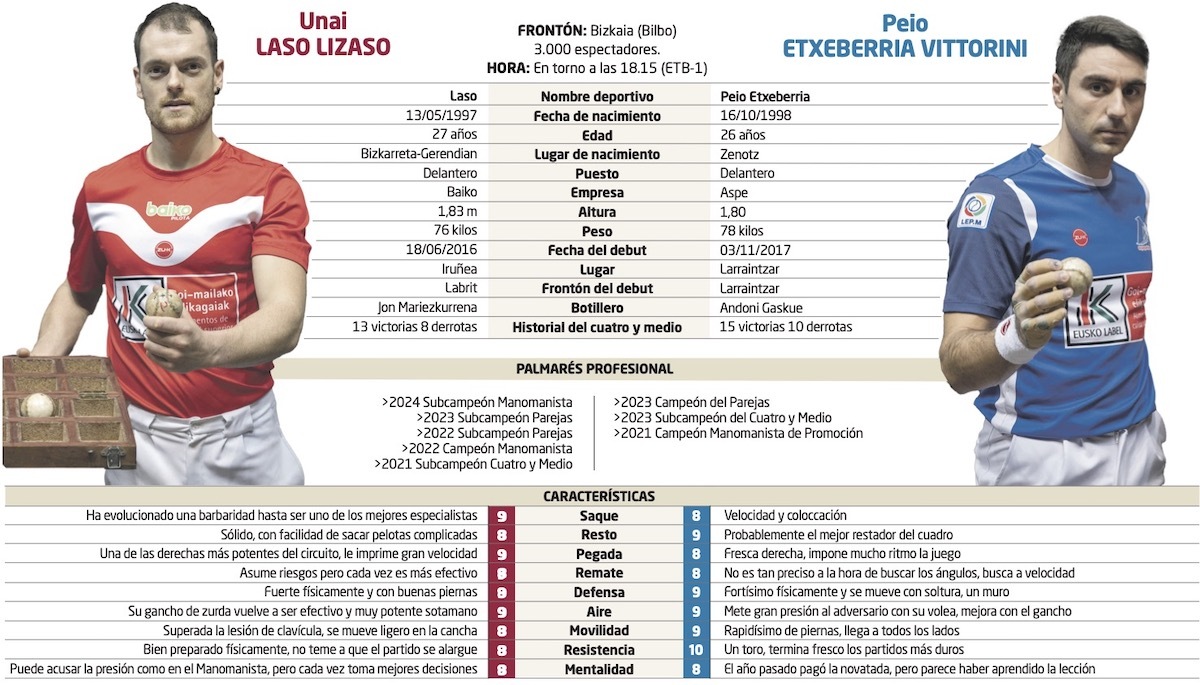 La final servirá, además, para que uno de los dos se saque la espina de su última final individual ante Jokin Altuna. El de Aspe cayó en la de la jaula del año pasado por 22-9, mientras que Laso no pasó del cartón 5 en la final Manomanista de este mismo año.