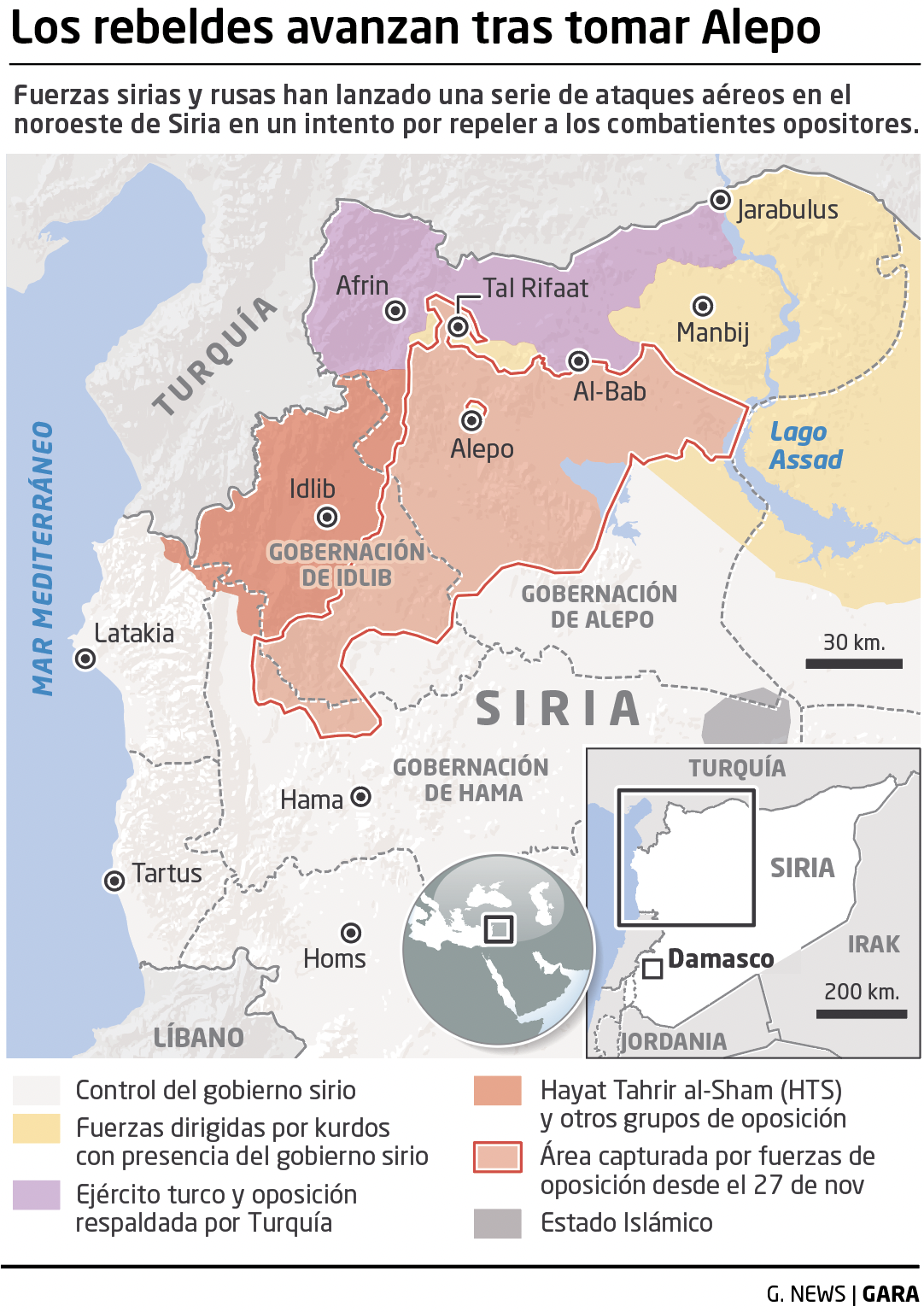 En dos días, y con el régimen de Damasco en retirada, tomaron el control de la segunda ciudad siria y capital económica del país, Alepo, matando en ataques suicidas al máximo responsable sirio de su defensa y a un general de la Guardia Revolucionaria iraní.
