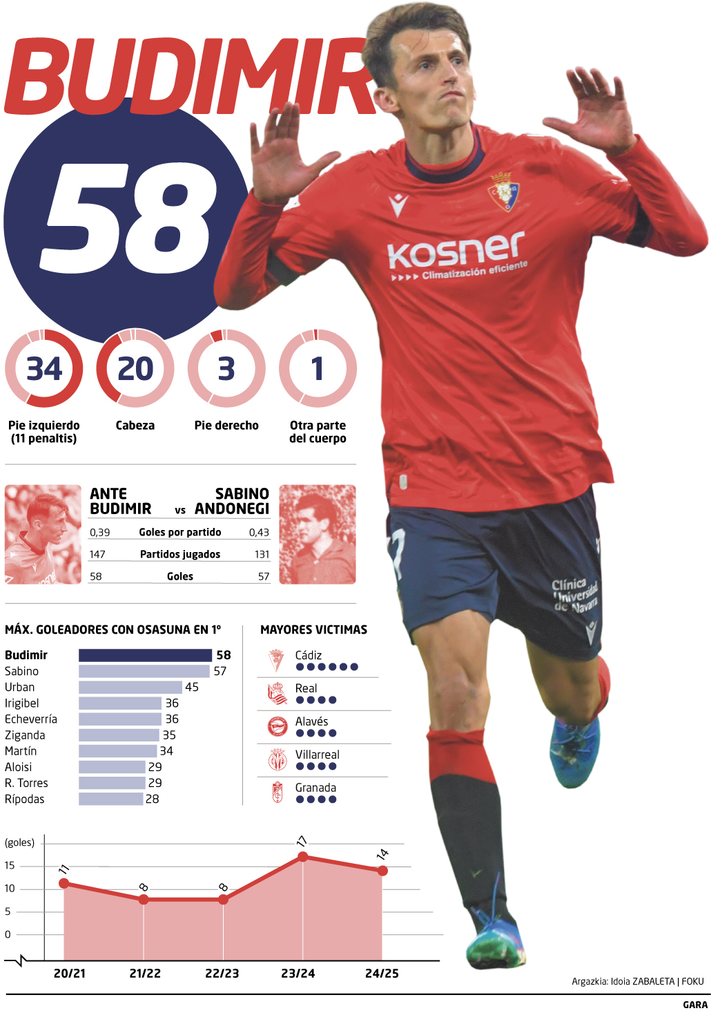 Gracias a su diana ante el Valencia, Budimir entra con letras de oro en la historia rojilla como máximo artillero en Primera –58 tantos–, superando a otro mito, Sabino Andonegi. Lo que en 2021 parecía una operación arriesgada se ha traducido en una inversión goleadora que ha dado multitud de puntos.
