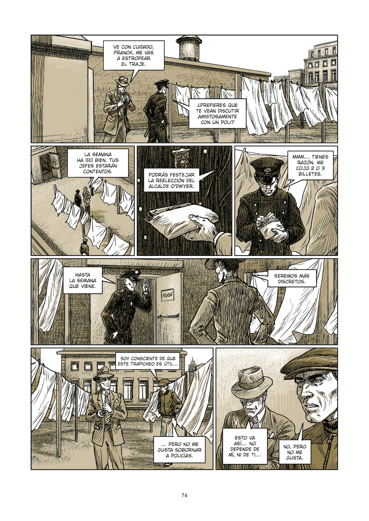 Apoyado en la acertada decisión de aportar una pigmentación distintiva a las viñetas en función de la época que pretenden acoger, este recorrido, previo paso por un fogonazo actual a modo de introducción a este viaje en el tiempo, se inicia trasladándose hasta ejemplos embrionarios de ese ánimo de custodiar el buen comportamiento, concepto, y su consiguiente cuestionamiento, que se instala como epicentro reflexivo de esta obra. Porque aunque es la industrialización y las grandes urbes, reflejo a su vez de un incremento exponencial de las tasas de marginalidad y pobreza, quienes definen el nacimiento de la policía como entidad, lo cierto es que siempre han existido grupos autogestionados encomendados a una labor similar, como explican los personajes del cuadro de Rembrandt, ‘La ronda de noche’, que toman vida para alumbrar la naturaleza de lo que no eran sino patrullas nocturnas efectuadas para mantener a buen recaudo los intereses de las clases burguesas.