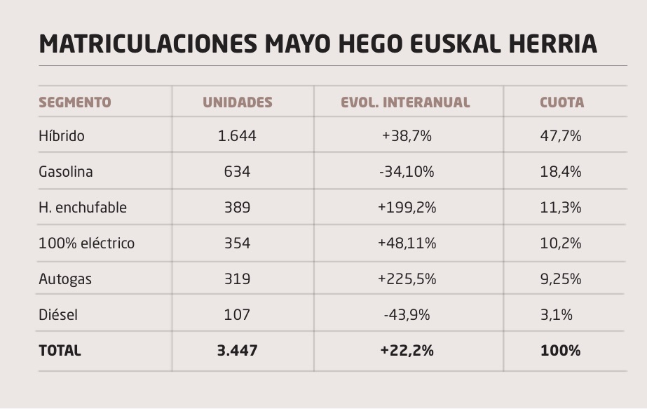 En cualquier caso, la caída de los gasolina no debe ocultar que siguen siendo los modelos más vendidos después de los híbridos no enchufables, ya que en mayo se matricularon en Hego Euskal Herria 634 unidades, casi tantas como todos los enchufables (híbridos PHEV y eléctricos).
