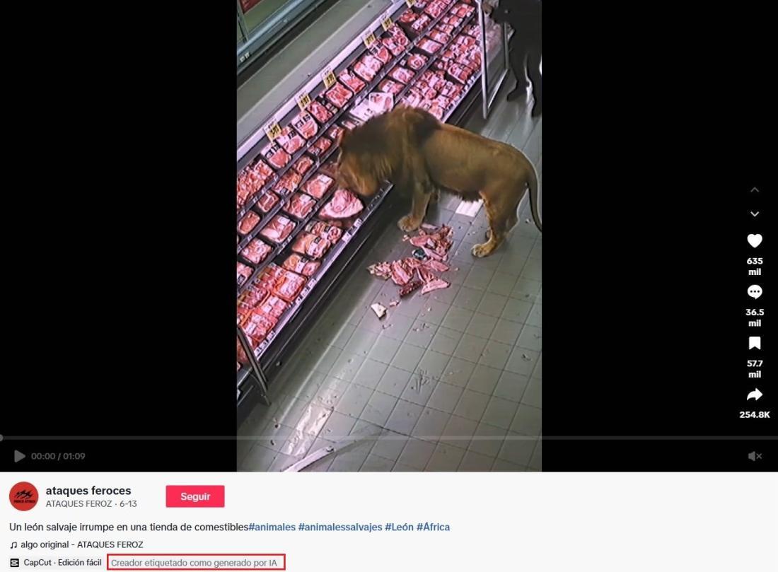 El vídeo viral atribuye los créditos a «@ataquesferoz», que pertenece a una cuenta de TikTok. El post original fue publicado el 13 de junio de 2025, con el título «Un león salvaje irrumpe en una tienda de comestibles#animales #animalessalvajes #León #África». El material está marcado como generado por IA.