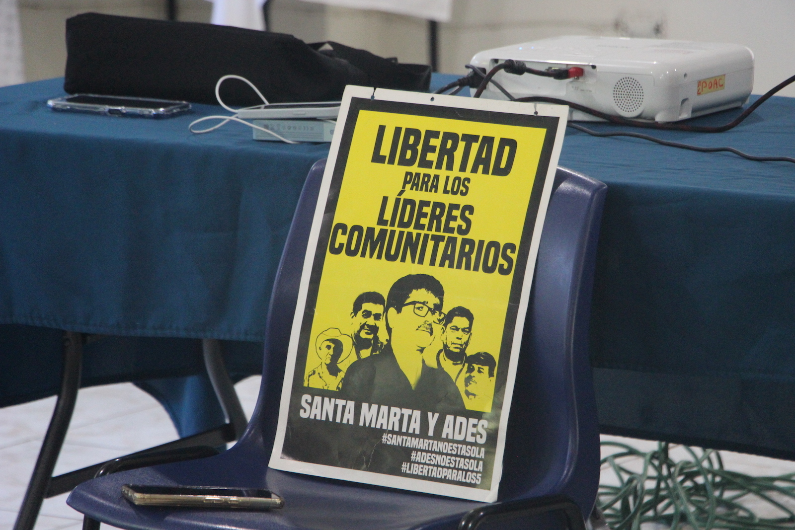 Cartel que pide la libertad de los Cinco de Santa Marta. (Rene POSADA/ACAFREMIN)