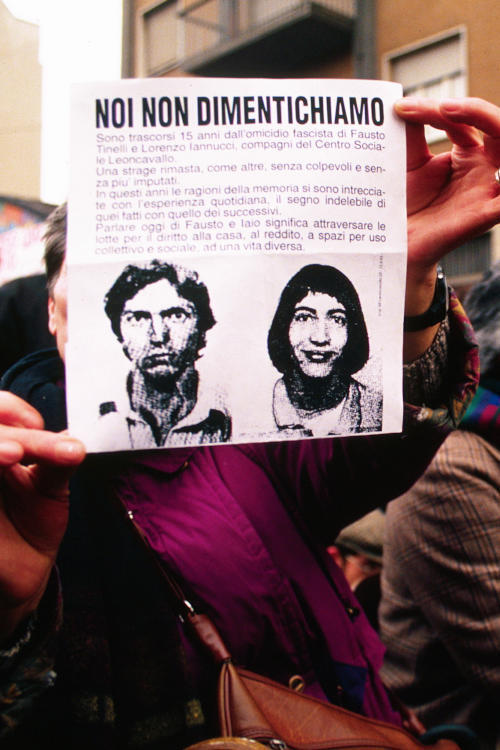 Un primer punto de inflexión ocurrió el 18 de marzo de 1978, mientras toda Italia estaba pensando en el «caso Aldo Moro», el secuestro del presidente de la Democrazia Cristiana por parte de las Brigadas Rojas, que acabaría con su ejecución. Aquella noche, en una calle pegada al viejo Leoncavallo, Via Mancinelli, mataron a dos jóvenes militantes del ‘Leonka’: Fausto Tinelli y Lorenzo ‘Iaio’ Iannucci. Estaban volviendo a casa y alguien, que nunca ha sido descubierto, utilizando una pistola con silenciador les quitó la vida. El trabajo perfecto de un killer.