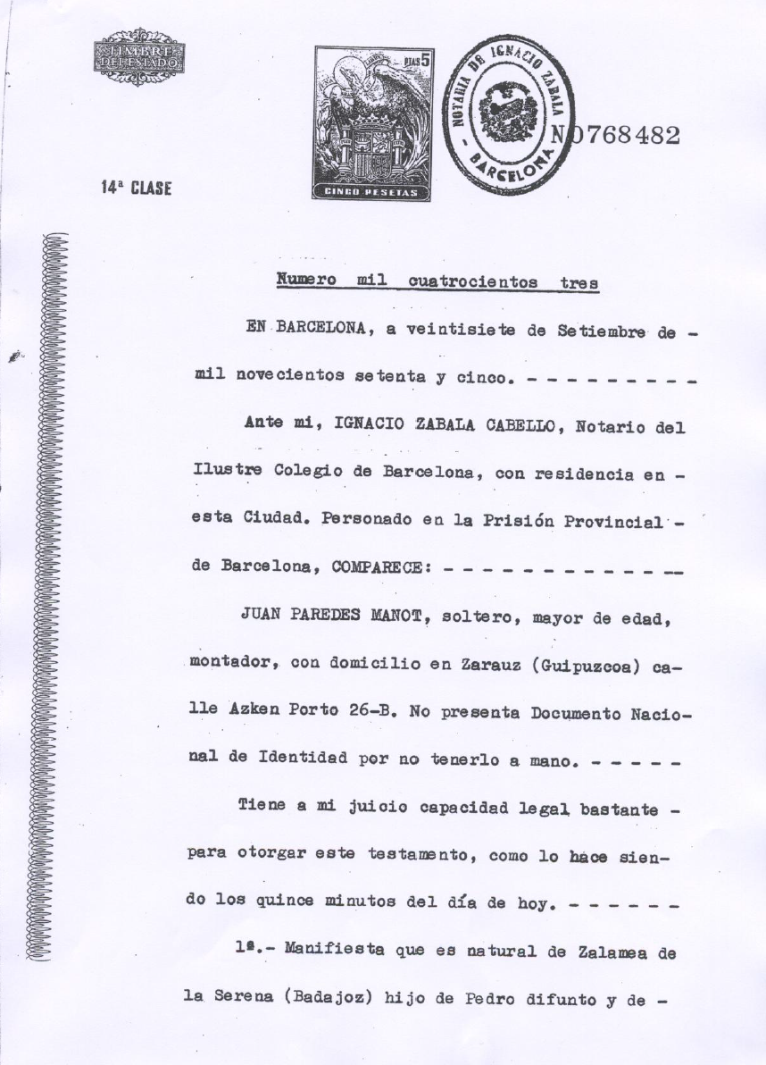 Son apenas seis folios en papel timbrado notarial, un testamento al uso. Pero no se limita a repartir bienes, sino que contiene un alegato político completo. Lo escribió Jon Paredes ‘Txiki’ en Barcelona, en capilla, horas antes de ser ejecutado. NAIZ ha accedido a él y lo reproduce íntegro.