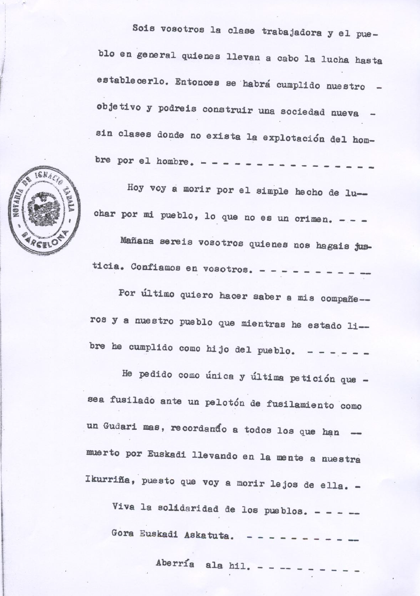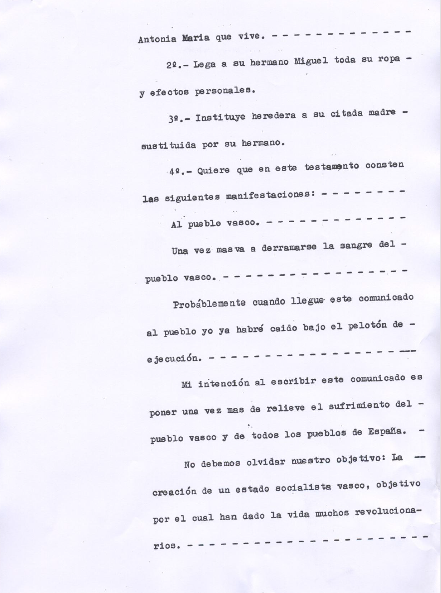 Una vez más va a derramarse la sangre del pueblo vasco. Probablemente cuando llegue este comunicado al pueblo, yo ya habré caído bajo el pelotón de ejecución.