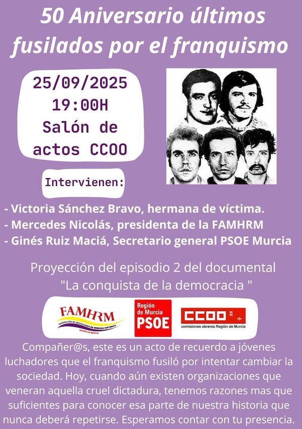 Las palabras pronunciadas por Rico en el mismo día del 50 aniversario de las ejecuciones de Txiki y Otaegi contrastan con los términos que se les dedicaba en la convocatoria de un acto celebrado el pasado jueves en Murcia por iniciativa del PSOE de ese territorio, junto a CCOO y la Federación de Asociaciones de Memoria Histórica de Murcia en recuerdo precisamente de los últimos fusilados por el franquismo.