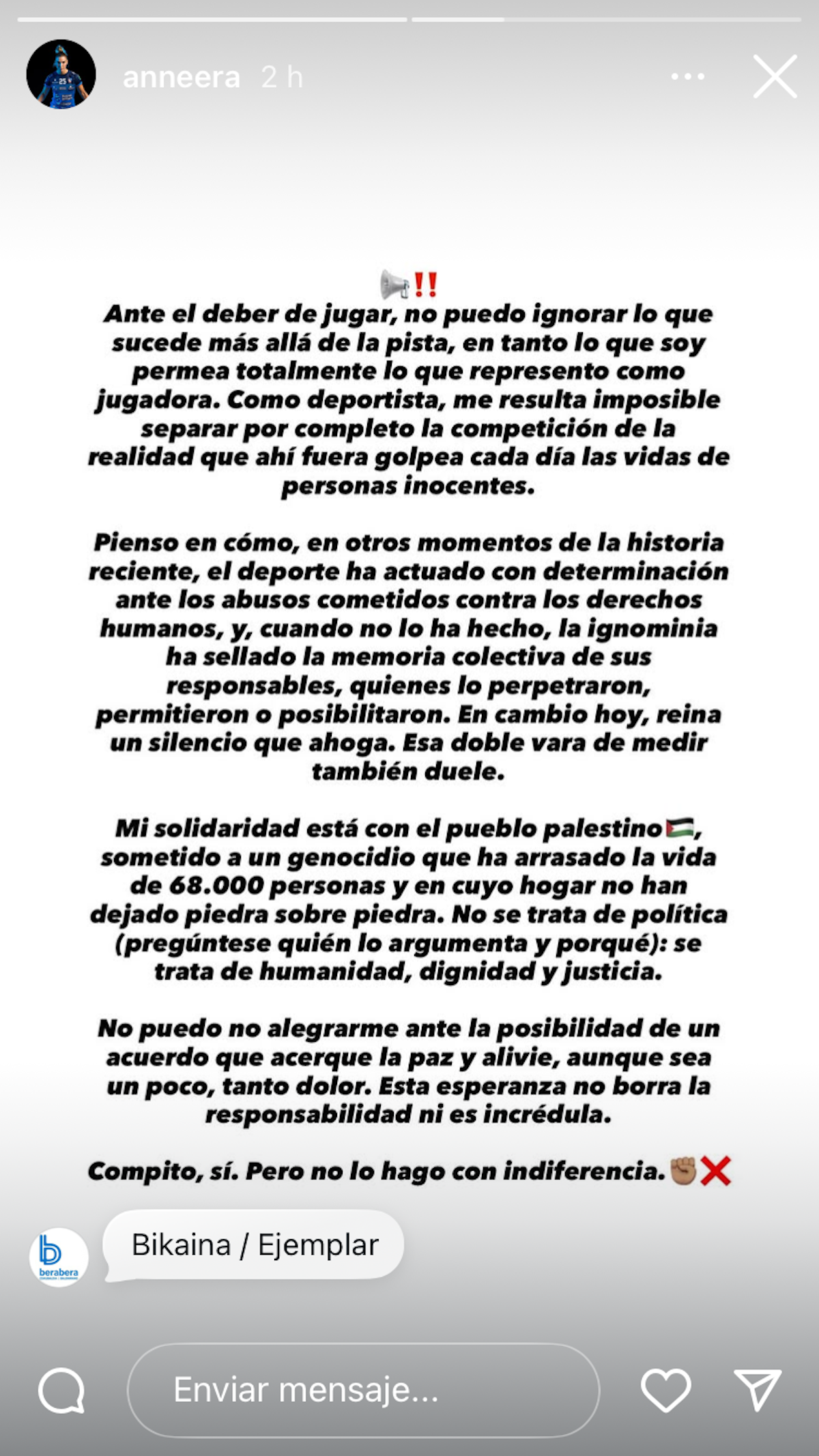 Las jugadoras del Bera Bera Anne Erauskin, Maitane Etxeberria y Lyndie Tchapchet han hecho público un comunicado en el que expresan su postura crítica ante la situación en Palestina, coincidiendo con la previa del partido que la selección española disputará frente a Israel en Bratislava –a puerta cerrada y sin televisión–.