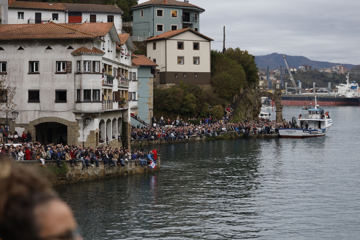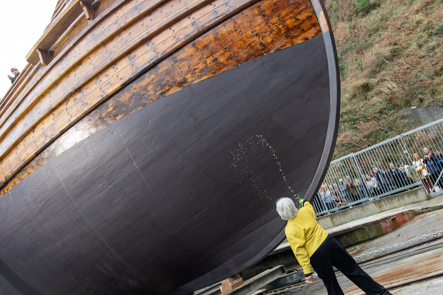 Ante la mirada de las miles de personas que se han dado cita en ambos lados de la bocana, Zaria Koru Eskola ha entonado el célebre ‘Jaiki, jaiki. Con Xabier Agote desde lo alto de la cubierta, Caroline Marchand, pareja del arqueólogo Robert Grenier, que no ha podido desplazarse hasta Pasaia por encontrarse enfermo, ha bautizado el casco con sidra, la bebida más usual en los barcos de aquella época.