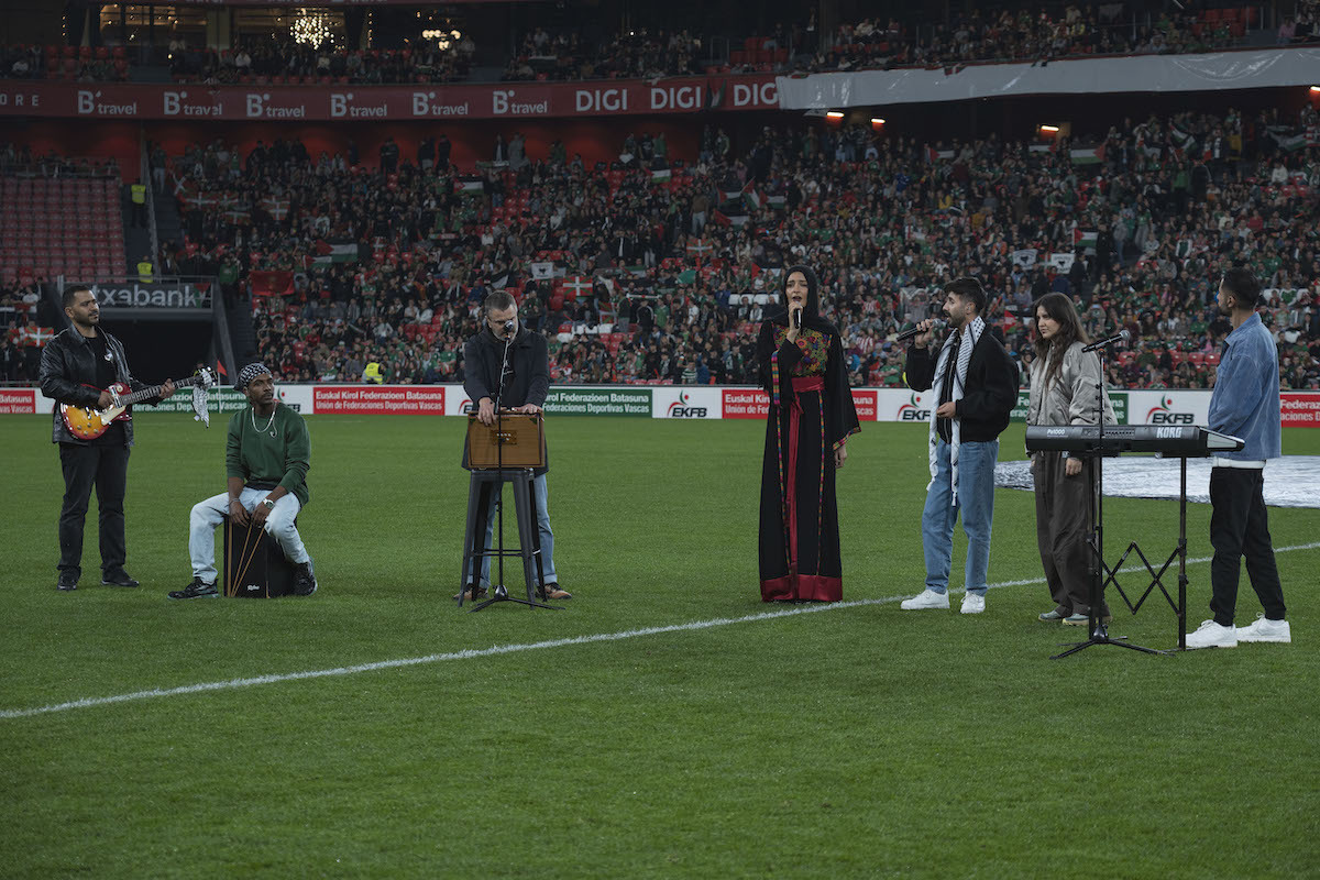 El 15 de noviembre, Sol Band fue uno de los protagonistas del histórico encuentro entre Euskal Selekzioa y Palestina en San Mamés. Ante más de 50.000 personas y acompañados por Eñaut Elorrieta e Izaro emocionaron al público con “Palestinians”, canción compuesta en pleno genocidio en un campamento de refugiados en Rafah, al sur de la Franja de Gaza.