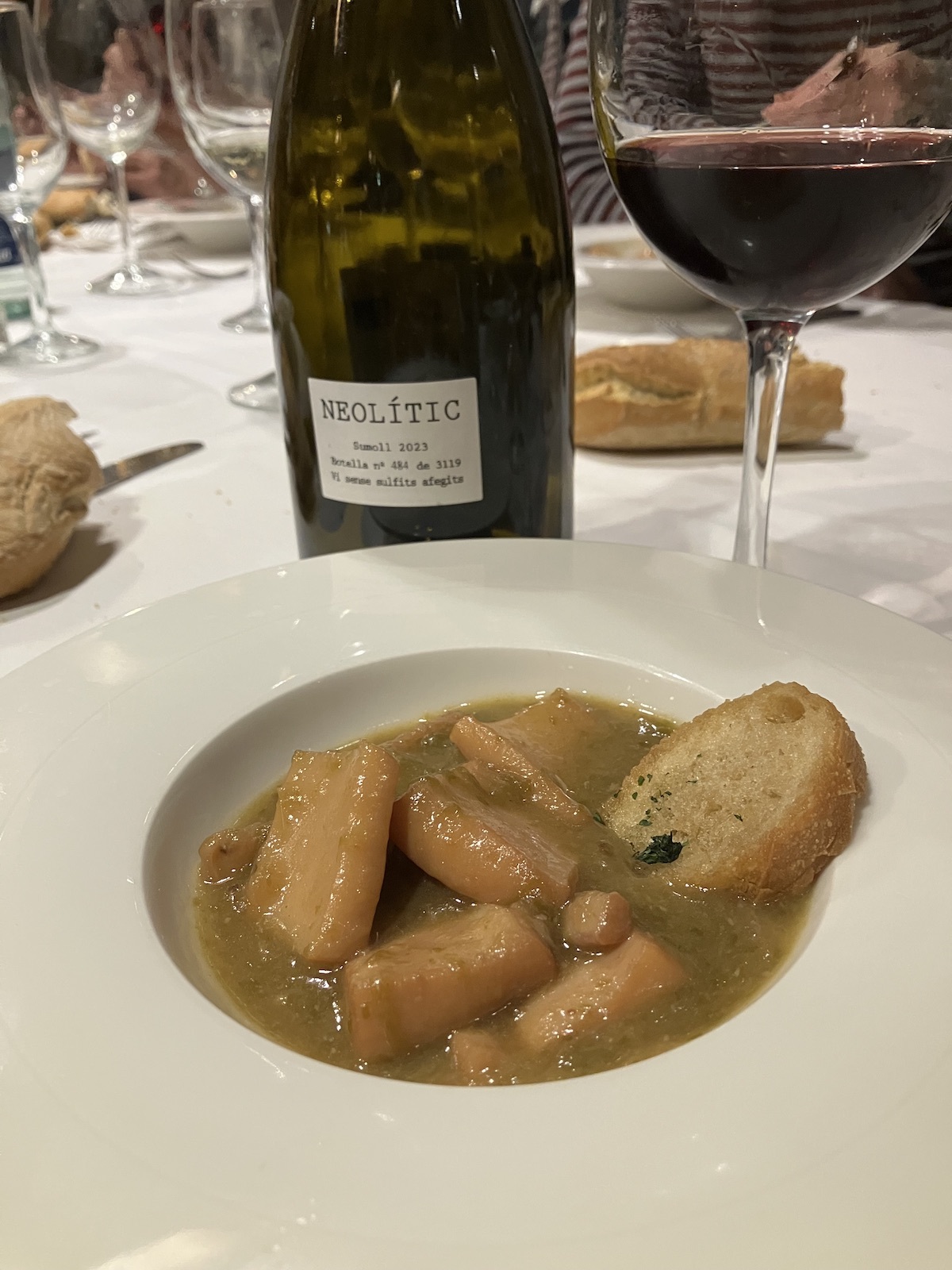 El tercer plato de la velada fue todo un clásico de la cocina vasca: los txipirones a lo Pelayo, en este caso elaborados con txipirón «begi-haundi» y su inconfundible salsa encebollada, maridados con “Neolitic 2023”, el primer tinto natural elaborado por Parés Baltà a partir de uva sumoll, variedad ancestral del Penedés de aromas a frutos rojos que estuvo a punto de desaparecer pero que ha sido recuperada por Parés Baltà.