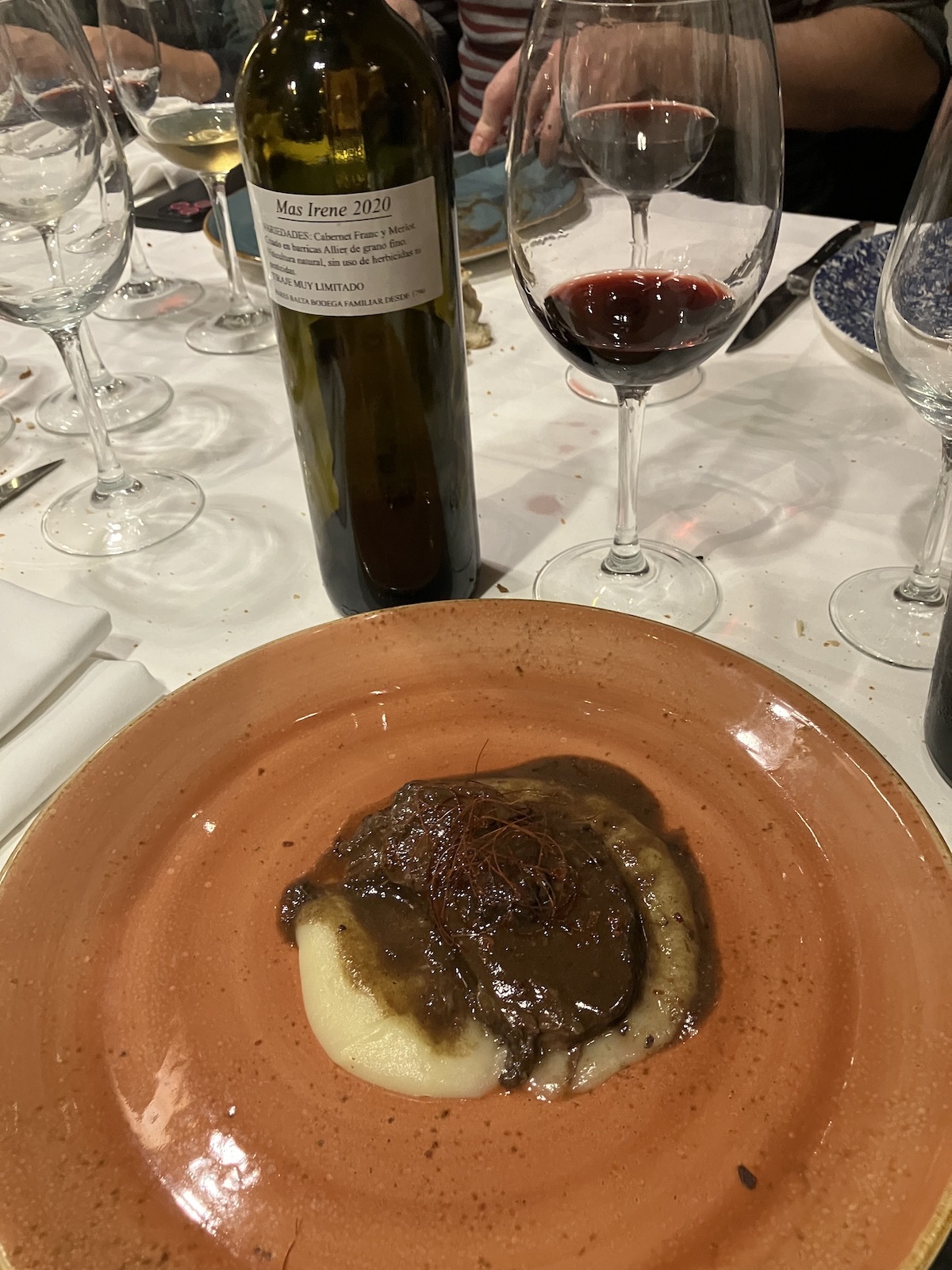 Antes de los postres, llegaba el turno de unas exquisitas carrilleras de buey con salsa de vino tinto y puré de patata natural, un plato que, como no podía ser de otra forma, estuvo acompañado de un tinto de corte clásico, el “Mas Irene 2020”, un crianza elaborado a partir de las variedades cabernet franc (70%) y merlot (30%) y que, según reveló la directora comercial de la bodega, es el preferido de Xabier Zabaleta.