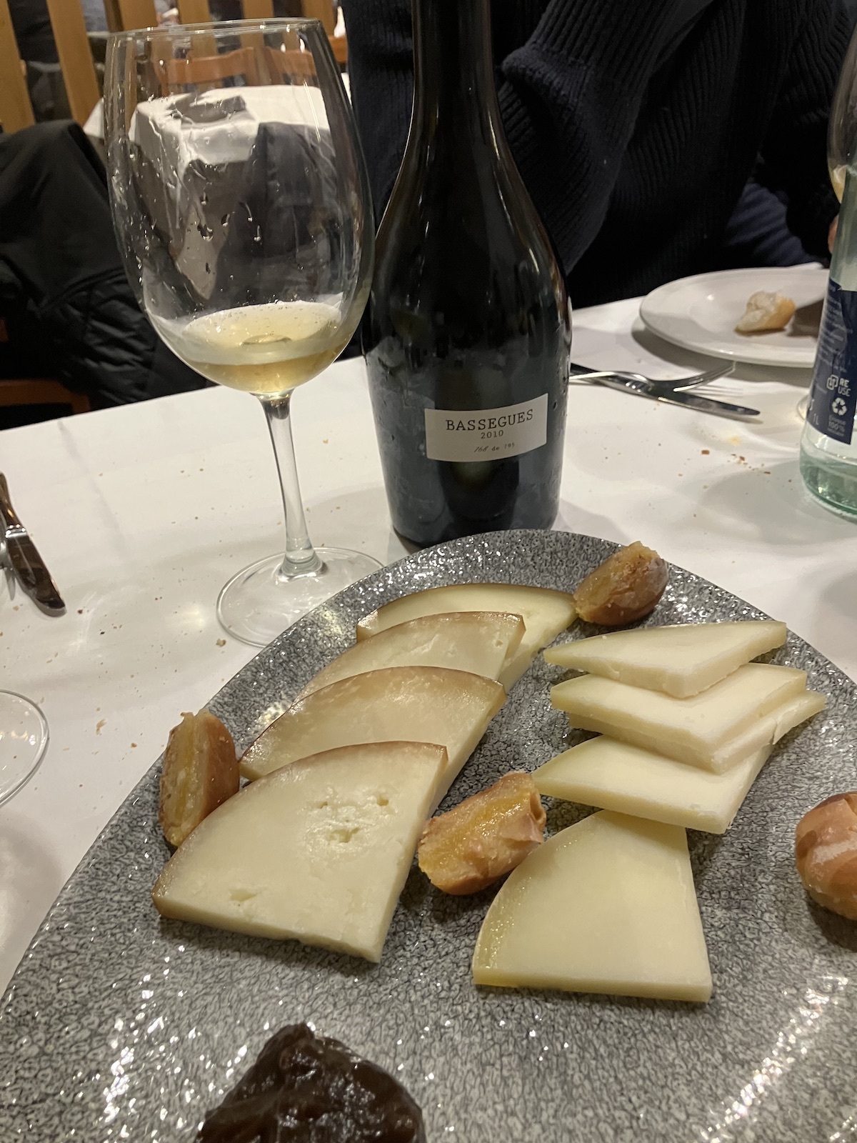Y para rematar la velada, una degustación de quesos -naturales y ahumados- de Azkarra, quesería alavesa de la denominación Idiazabal, con membrillo natural y pastelitos de yema y almendra del confitero Rafa Gorrotxategi. Todo ello regado con los aromas tostados de la joya de la corona de Parés Baltà, el “Bassegues 2010”, un cava de nada menos que 154 meses de crianza en barrica y dos años de degüelle, elaborado con uva charelo procedente de viñedos cultivados a 900 metros. Un espumoso parcelario del que solo se hicieron 795 botellas, dos de las cuales tuvimos el honor de descorchar en el restaurante Aratz.