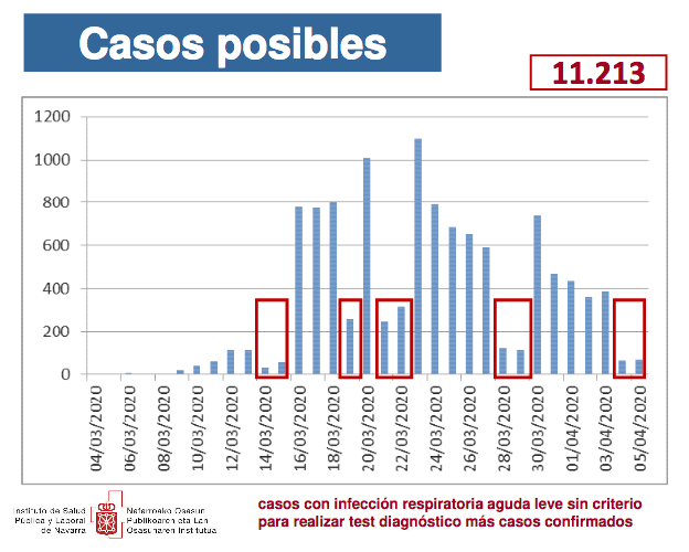En el marco de la lluvia diaria de datos, el Gobierno de Nafarroa ha ofrecido hoy una cifra desconocida hasta ahora: la de personas con infección respiratoria aguda leve a las que no se les ha hecho test y que el propio Gobierno clasifica como «casos posibles». Sumados los casos confirmados y posibles, la cifra llega a los 11.213.