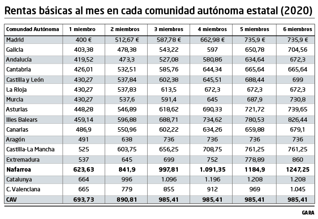 La Renta Garantizada de Nafarroa asciende actualmente a 624 euros y la RGI de la CAV supone 694 euros al mes. Son cantidades que le destacan en el ranking por comunidades del cuadro adjunto pero quedan bastante alejadas del salario mínimo interprofesional (SMI) y del umbral de la pobreza de Hego Euskal Herria.